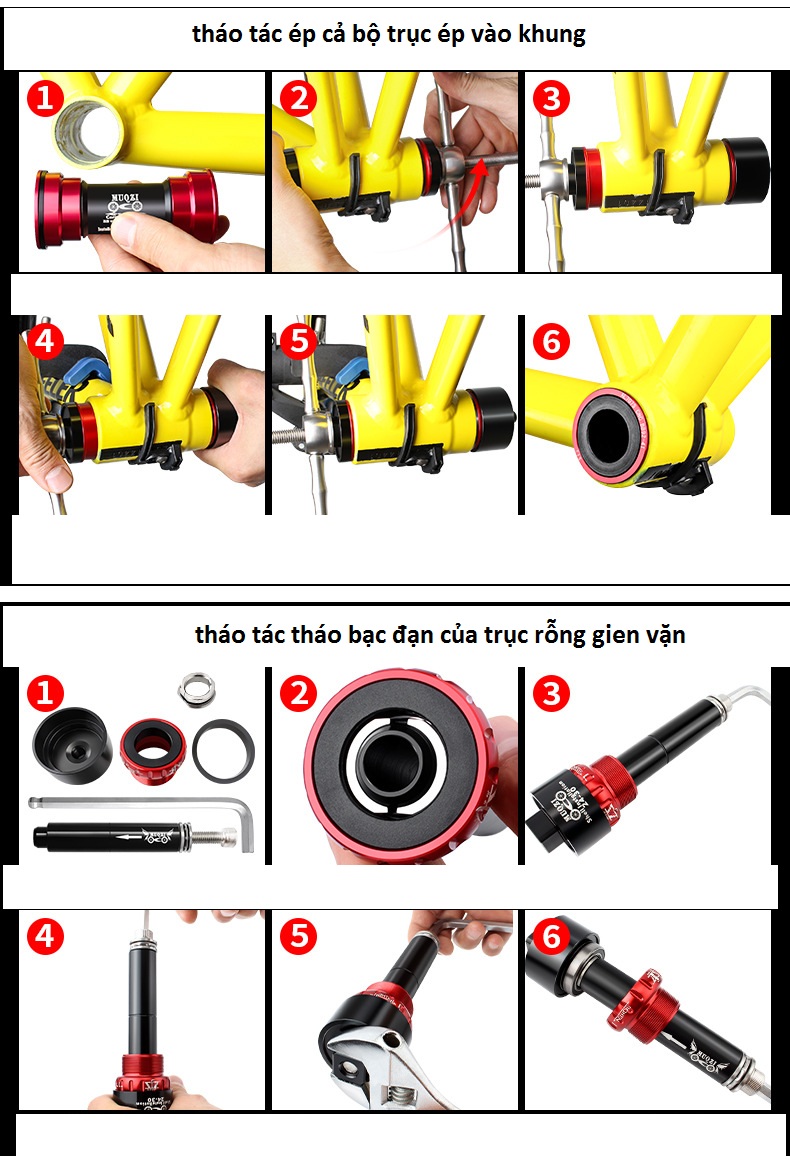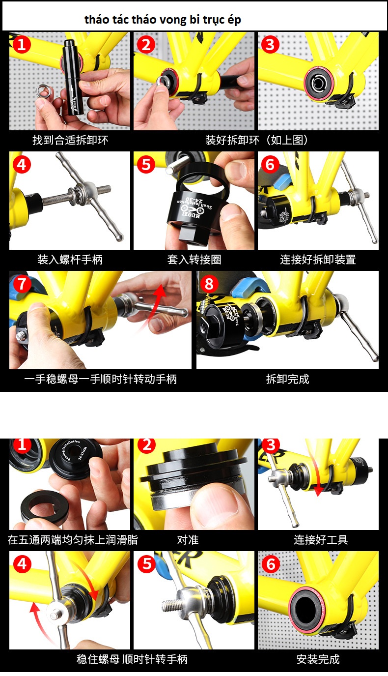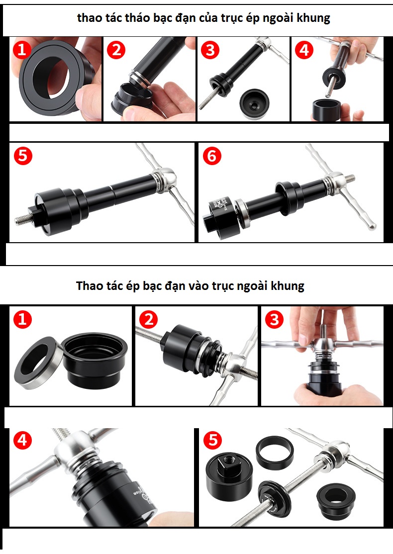 Bộ dụng cụ chuyên dùng để tháo vòng bi trục giữa BB dạng ép khung và tháo vòng bi trục Rỗng gien vặn . Các dòng trục này hiện nay thường được sử dụng trên các mẫu xe đua , địa hình cũng như Touring cao cấp .