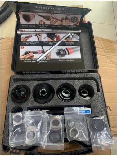 Dụng cụ chuyên dùng để tháo vòng bi ra , cũng như tháo cả bộ trục ra khỏi khung thay thế trục mới và lắp lại . bộ dụng cụ bao gồm các đồ ép bi , các đồ gá tháo bi cũng như các nắp để sử dụng trong quá trình tháo lắp .