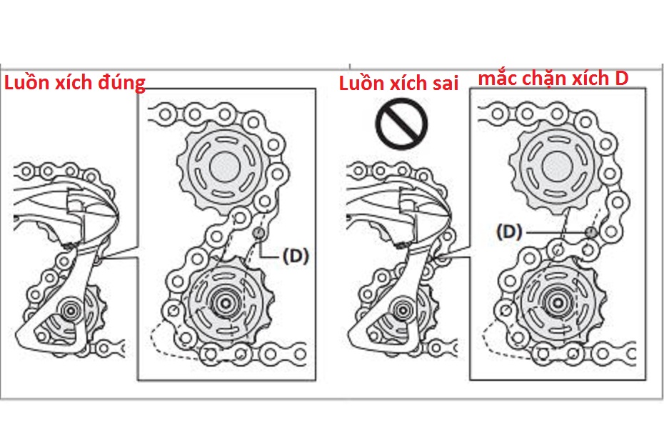 Cách luồn xích đúng khi thay củ đề . khi thay củ đề mọi người thường hay bị luồn nhầm dẫn đến xích chạy móc vào điểm ( D ) trên ảnh dẫn đến khi quay hoặc đạp xe có tiếng kêu .